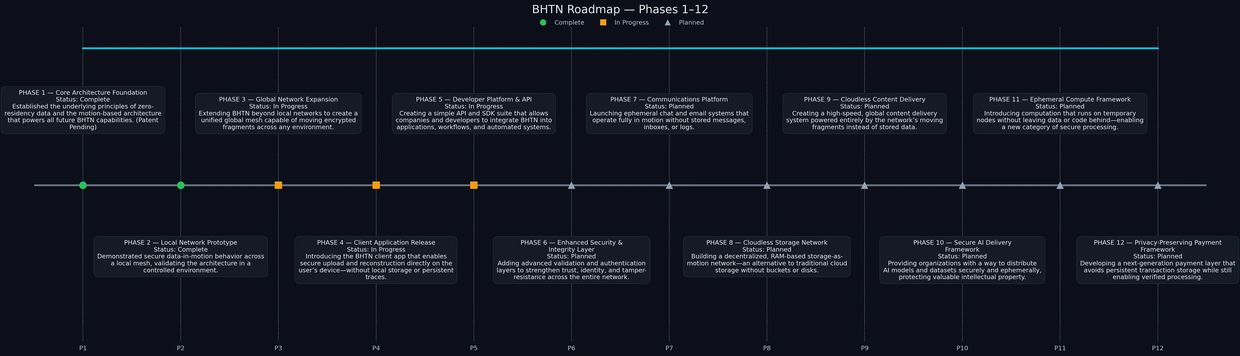 The BHTN roadmap outlines our evolution from a breakthrough zero-residency data architecture into a global, secure, and fully decentralized data-in-motion network. Beginning with foundational research and local prototypes, we expand into a worldwide mesh, a client-driven application layer, and a developer ecosystem that enables seamless integration. Future phases introduce advanced security, ephemeral communications, cloudless storage, high-speed content delivery, secure AI artifact distribution, and next-generation compute and payment frameworks. Together, these phases form a unified vision: a world where data never rests, security is intrinsic, and digital systems operate without the vulnerabilities of traditional storage-based architectures.